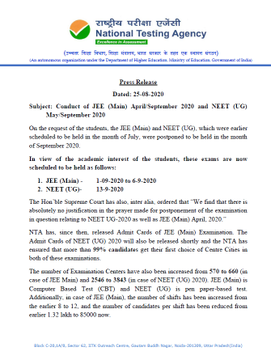 #JEEMain की परीक्षा 1 से 6 सितंबर के बीच और #NEET की परीक्षा 13 सितंबर को होगी आयोजित